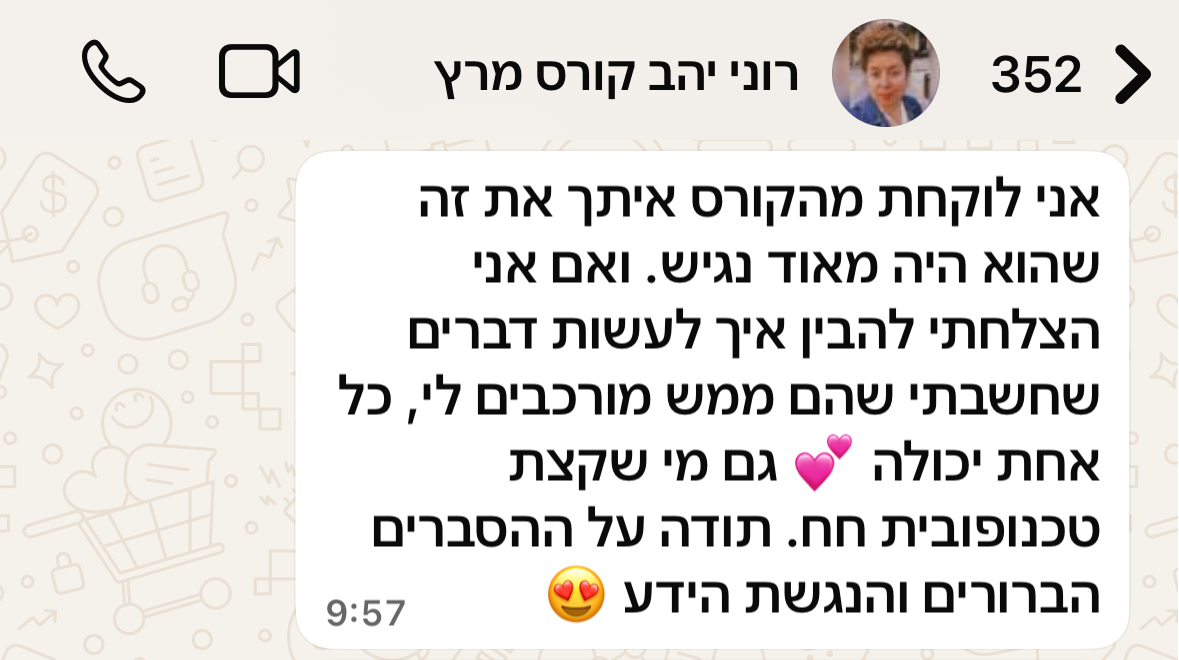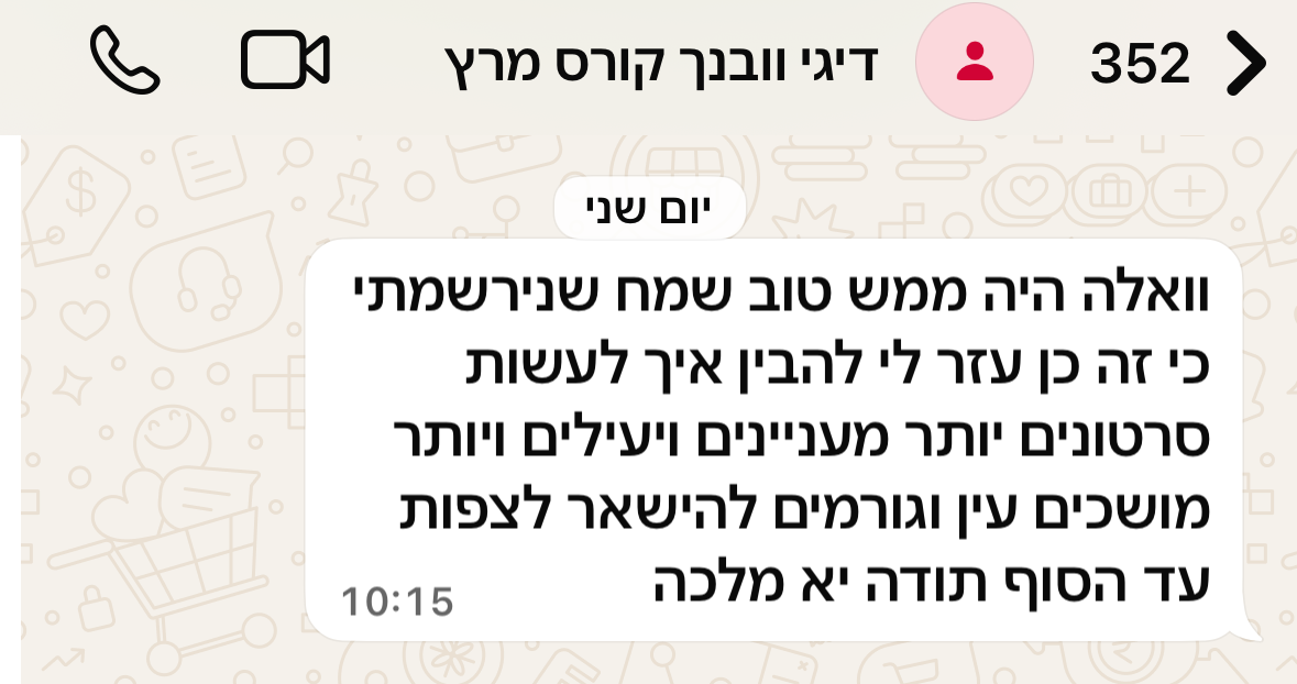 בניגוד לקורסים דיגיטליים שקונים ונשארים "על המדף" ולא תמיד באמת פותחים או מיישמים, כאן את נכנסת לתהליך שלוקח אותך יד ביד מהבסיס ומראה לך תכלס מה עושים.